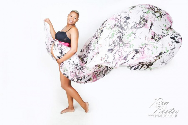 They hired some skirts from me which we have available for the photoshoot as well. Segomotso chose our blue and white layered skirt as well as a pink floral. She wore these simply over her own lingerie. These skirts are really long and made with a light material so any breeze will pick them up if they are lifted. So they work really well outside. While indoors husband Bafana helped to get the skirts flowing nicely around our beautiful pregnant mum to be under my instruction.